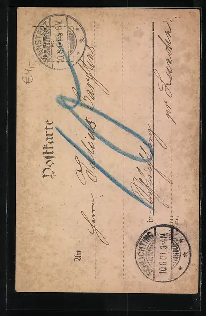 Personenbezogene Daten auf der Rückseite der Karte wurden durch blauen Textmarker unkenntlich gemacht. Die blauen Stellen sind auf die Vorderseite durchgeweicht und wirken sich negativ auf das Postkartenfoto aus