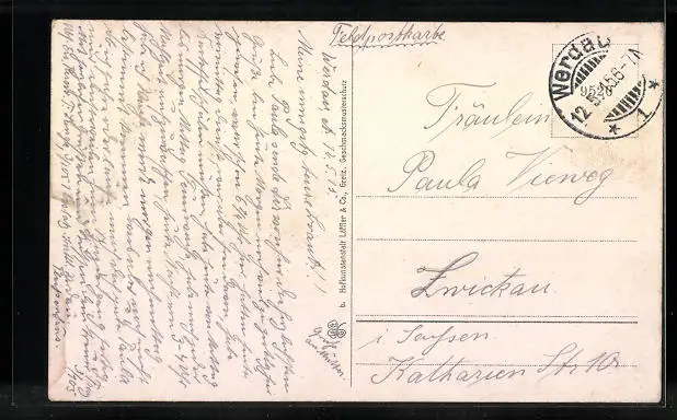 alte Ansichtskarte, gelaufen 1915 als Feldpost, Bugspur oben li., guter Zustand