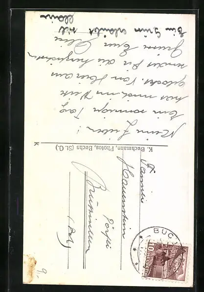 Personenbezogene Daten auf der Rückseite der Karte wurden durch blauen Textmarker unkenntlich gemacht. Die blauen Stellen sind auf die Vorderseite durchgeweicht und wirken sich negativ auf das Postkartenfoto aus