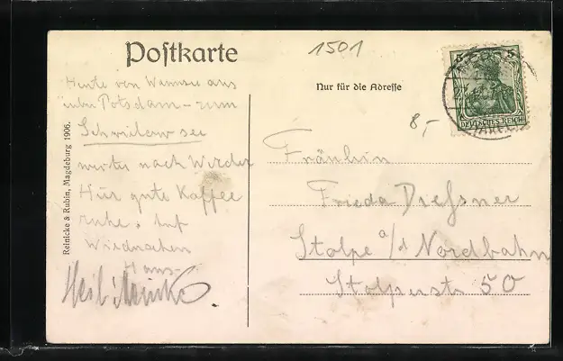 Personenbezogene Daten auf der Rückseite der Karte wurden durch blauen Textmarker unkenntlich gemacht. Die blauen Stellen sind auf die Vorderseite durchgeweicht und wirken sich negativ auf das Postkartenfoto aus