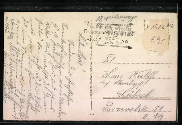 Personenbezogene Daten auf der Rückseite der Karte wurden durch blauen Textmarker unkenntlich gemacht. Die blauen Stellen sind auf die Vorderseite durchgeweicht und wirken sich negativ auf das Postkartenfoto aus