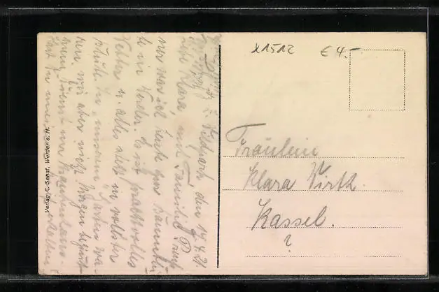 Personenbezogene Daten auf der Rückseite der Karte wurden durch blauen Textmarker unkenntlich gemacht. Die blauen Stellen sind auf die Vorderseite durchgeweicht und wirken sich negativ auf das Postkartenfoto aus