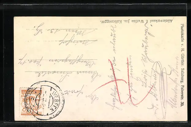 Personenbezogene Daten auf der Rückseite der Karte wurden durch blauen Textmarker unkenntlich gemacht. Die blauen Stellen sind auf die Vorderseite durchgeweicht und wirken sich negativ auf das Postkartenfoto aus