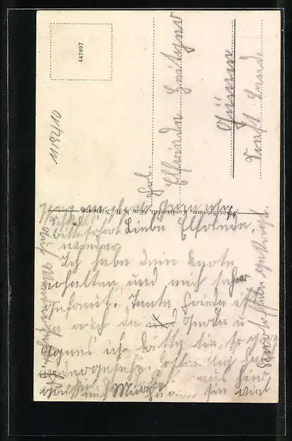Personenbezogene Daten auf der Rückseite der Karte wurden durch blauen Textmarker unkenntlich gemacht. Die blauen Stellen sind auf die Vorderseite durchgeweicht und wirken sich negativ auf das Postkartenfoto aus