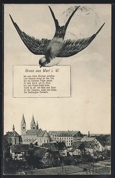 AK Werl i. W., Ortspartie mit Kirche und Schwalbe