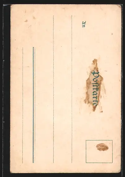 Personenbezogene Daten auf der Rückseite der Karte wurden durch blauen Textmarker unkenntlich gemacht. Die blauen Stellen sind auf die Vorderseite durchgeweicht und wirken sich negativ auf das Postkartenfoto aus
