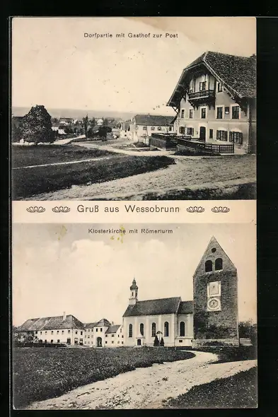 AK Wessobrunn, Gasthof zur Post, Klosterkirche mit Römerturm