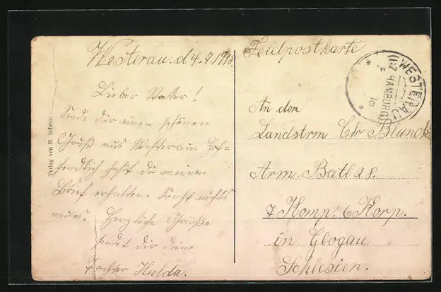 alte Ansichtskarte, gelaufen als Feldpost 1918, Eckknick re. oben, Bugspur re. unten, guter Zustand