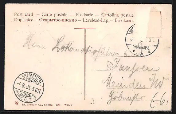 alte Ansichtskarte, gelaufen 1905, Briefmarke entfernt, rückseitig Oberflächenschaden, guter Zustand