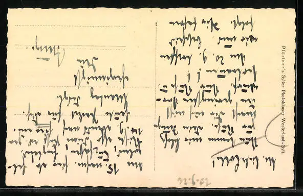 Personenbezogene Daten auf der Rückseite der Karte wurden durch blauen Textmarker unkenntlich gemacht. Die blauen Stellen sind auf die Vorderseite durchgeweicht und wirken sich negativ auf das Postkartenfoto aus