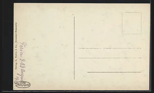 Personenbezogene Daten auf der Rückseite der Karte wurden durch blauen Textmarker unkenntlich gemacht. Die blauen Stellen sind auf die Vorderseite durchgeweicht und wirken sich negativ auf das Postkartenfoto aus