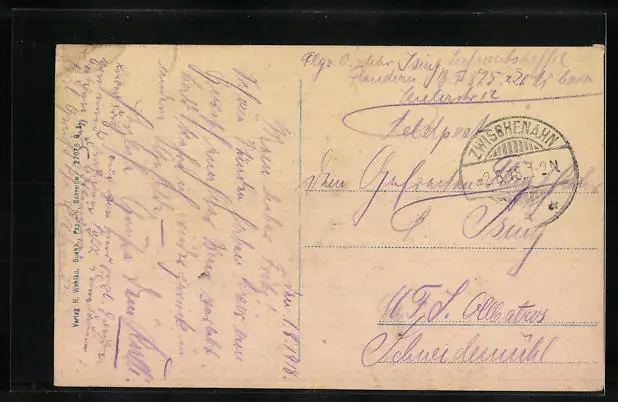 alte Ansichtskarte, gelaufen 1918 als Feldpost, Eckknicke re., Einriss re. oben, guter Zustand