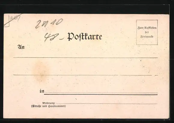 Personenbezogene Daten auf der Rückseite der Karte wurden durch blauen Textmarker unkenntlich gemacht. Die blauen Stellen sind auf die Vorderseite durchgeweicht und wirken sich negativ auf das Postkartenfoto aus