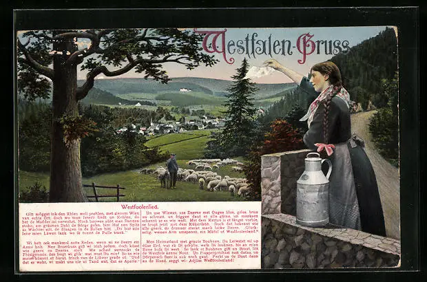 AK Westfalengruss, Junge Frau in Tracht winkt dem Schäfer zu, Westfalenlied