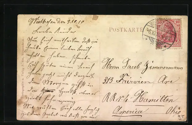 alte Ansichtskarte, gelaufen 1910, Bugspur diag. unten li., Stempelspur, guter Zustand