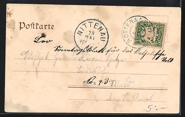 Personenbezogene Daten auf der Rückseite der Karte wurden durch blauen Textmarker unkenntlich gemacht. Die blauen Stellen sind auf die Vorderseite durchgeweicht und wirken sich negativ auf das Postkartenfoto aus