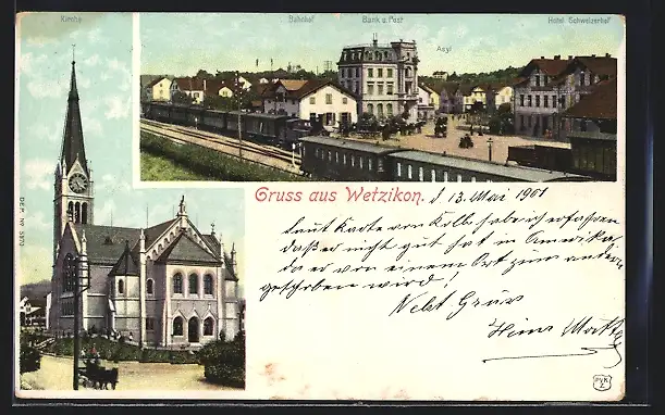 AK Wetzikon, Kirche, Bahnhof, Bank und Post