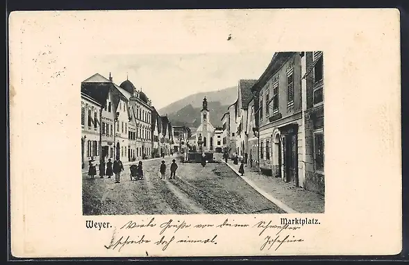AK Weyer, Marktplatz mit Brunnen und Kirche