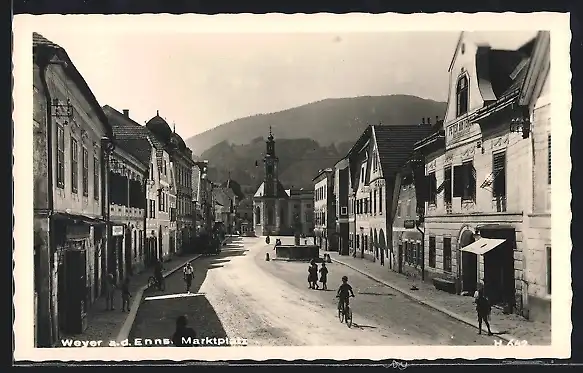 AK Weyer a. d. Enns, Marktplatz mit Geschäften und Kirche