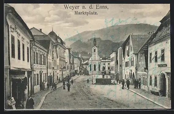AK Weyer a. d. Enns, Marktplatz mit Kirche und Brunnen