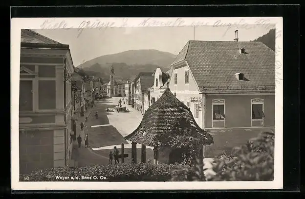 AK Weyer a. d. Enns /O.-Oe., Strassenpartie mit Brunnen