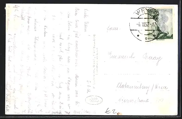 gelaufen 1952, Briefmarke entfernt, rückseitig Klebe- und Papierreste, guter Zustand