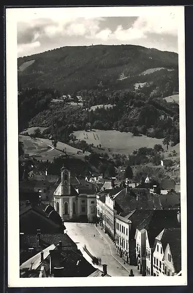 AK Weyer a. d. Enns, Strassenpartie mit Kirche aus der Vogelschau
