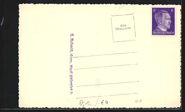 Personenbezogene Daten auf der Rückseite der Karte wurden durch blauen Textmarker unkenntlich gemacht. Die blauen Stellen sind auf die Vorderseite durchgeweicht und wirken sich negativ auf das Postkartenfoto aus
