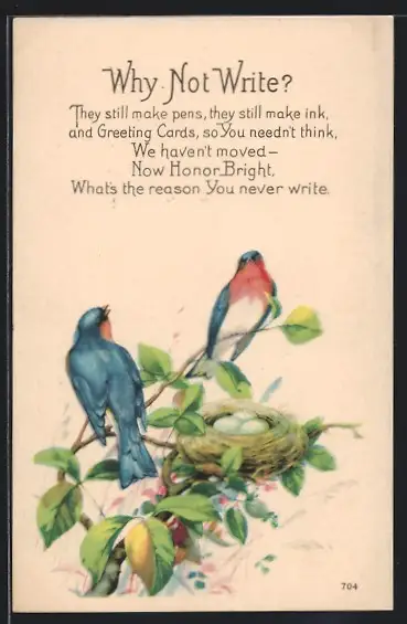 AK Why Not Write?, Zwei Vögel am Nest, Schreibfaul