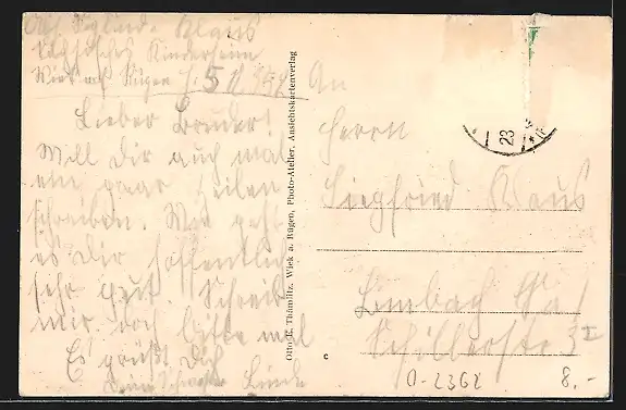 Personenbezogene Daten auf der Rückseite der Karte wurden durch blauen Textmarker unkenntlich gemacht. Die blauen Stellen sind auf die Vorderseite durchgeweicht und wirken sich negativ auf das Postkartenfoto aus