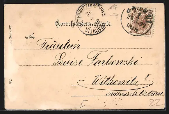 alte Ansichtskarte, gelaufen 1897, rückseitig Oberflächenschaden, guter Zustand