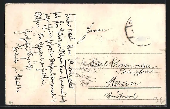 alte Ansichtskarte, gelaufen, Briefmarke entfernt, rückseitig Oberflächenschaden, minimaler Einriss li. mittig, guter Zustand