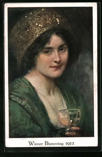 AK Wien, Blumentag 1912, Frau mit Weinglas