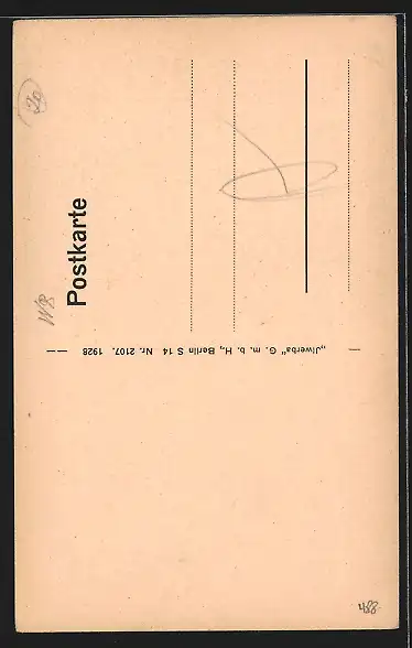 Personenbezogene Daten auf der Rückseite der Karte wurden durch blauen Textmarker unkenntlich gemacht. Die blauen Stellen sind auf die Vorderseite durchgeweicht und wirken sich negativ auf das Postkartenfoto aus
