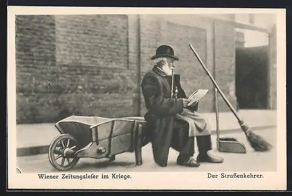 AK Wien, Der Strassenkehrer liest Zeitung im Kriege, Kriegsnot