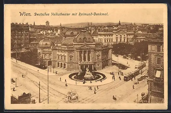 AK Wien, Deutsches Volkstheater mit Raimund-Denkmal, Strassenbahn
