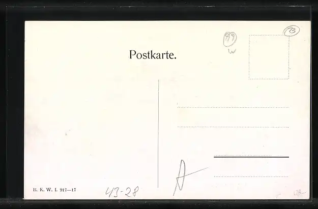 Personenbezogene Daten auf der Rückseite der Karte wurden durch blauen Textmarker unkenntlich gemacht. Die blauen Stellen sind auf die Vorderseite durchgeweicht und wirken sich negativ auf das Postkartenfoto aus