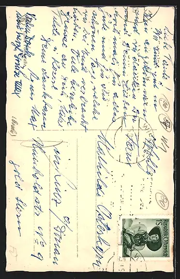 Personenbezogene Daten auf der Rückseite der Karte wurden durch blauen Textmarker unkenntlich gemacht. Die blauen Stellen sind auf die Vorderseite durchgeweicht und wirken sich negativ auf das Postkartenfoto aus