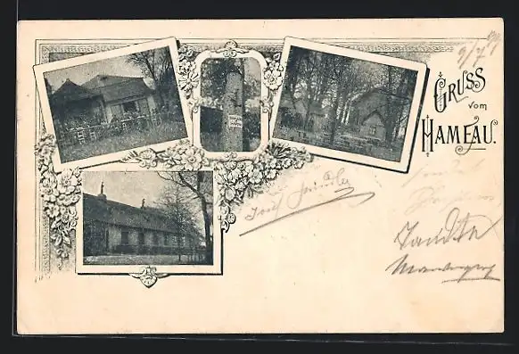 Personenbezogene Daten auf der Rückseite der Karte wurden durch blauen Textmarker unkenntlich gemacht. Die blauen Stellen sind auf die Vorderseite durchgeweicht und wirken sich negativ auf das Postkartenfoto aus