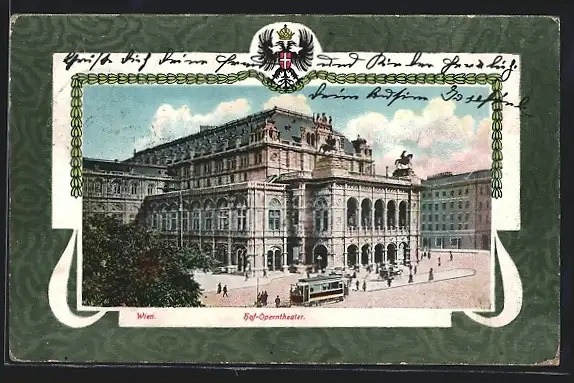 AK Wien, Hof-Operntheater mit Strassenbahn, Wappen