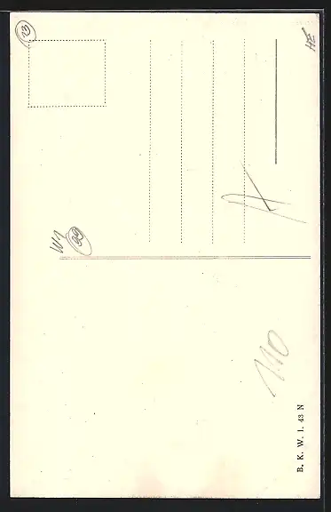 Personenbezogene Daten auf der Rückseite der Karte wurden durch blauen Textmarker unkenntlich gemacht. Die blauen Stellen sind auf die Vorderseite durchgeweicht und wirken sich negativ auf das Postkartenfoto aus