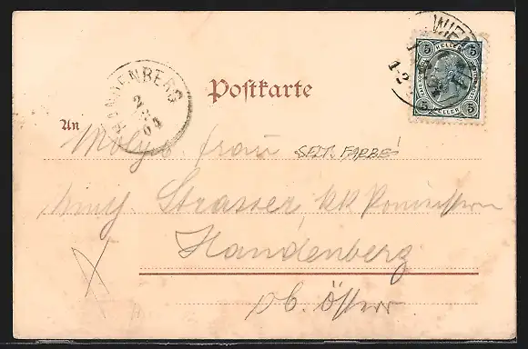 Personenbezogene Daten auf der Rückseite der Karte wurden durch blauen Textmarker unkenntlich gemacht. Die blauen Stellen sind auf die Vorderseite durchgeweicht und wirken sich negativ auf das Postkartenfoto aus