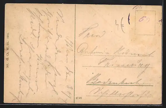 Personenbezogene Daten auf der Rückseite der Karte wurden durch blauen Textmarker unkenntlich gemacht. Die blauen Stellen sind auf die Vorderseite durchgeweicht und wirken sich negativ auf das Postkartenfoto aus