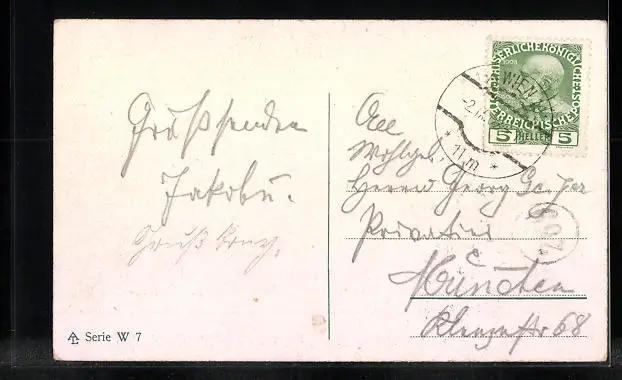 Personenbezogene Daten auf der Rückseite der Karte wurden durch blauen Textmarker unkenntlich gemacht. Die blauen Stellen sind auf die Vorderseite durchgeweicht und wirken sich negativ auf das Postkartenfoto aus