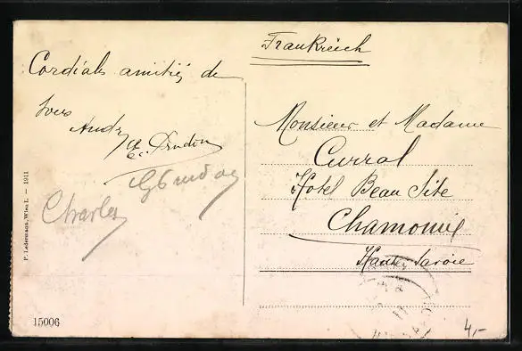 Personenbezogene Daten auf der Rückseite der Karte wurden durch blauen Textmarker unkenntlich gemacht. Die blauen Stellen sind auf die Vorderseite durchgeweicht und wirken sich negativ auf das Postkartenfoto aus
