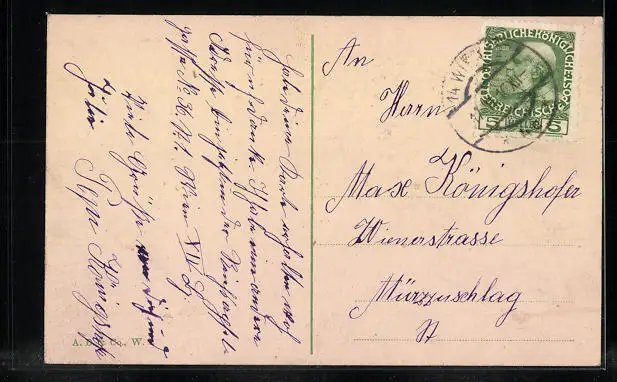 Personenbezogene Daten auf der Rückseite der Karte wurden durch blauen Textmarker unkenntlich gemacht. Die blauen Stellen sind auf die Vorderseite durchgeweicht und wirken sich negativ auf das Postkartenfoto aus