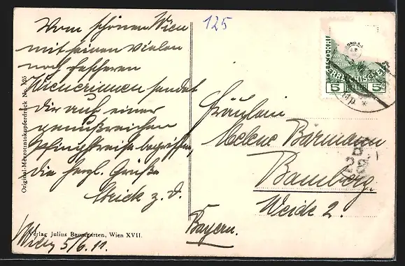 gelaufen 1911, Briefmarke entfernt, rückseitig Oberflächenschaden, guter Zustand