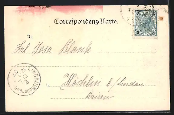 Personenbezogene Daten auf der Rückseite der Karte wurden durch blauen Textmarker unkenntlich gemacht. Die blauen Stellen sind auf die Vorderseite durchgeweicht und wirken sich negativ auf das Postkartenfoto aus