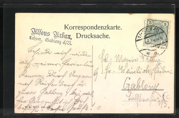 Personenbezogene Daten auf der Rückseite der Karte wurden durch blauen Textmarker unkenntlich gemacht. Die blauen Stellen sind auf die Vorderseite durchgeweicht und wirken sich negativ auf das Postkartenfoto aus