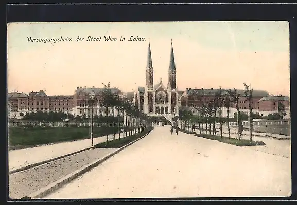 AK Wien, Lainz, Versorgungsheim mit Kirche und Strassenpartie
